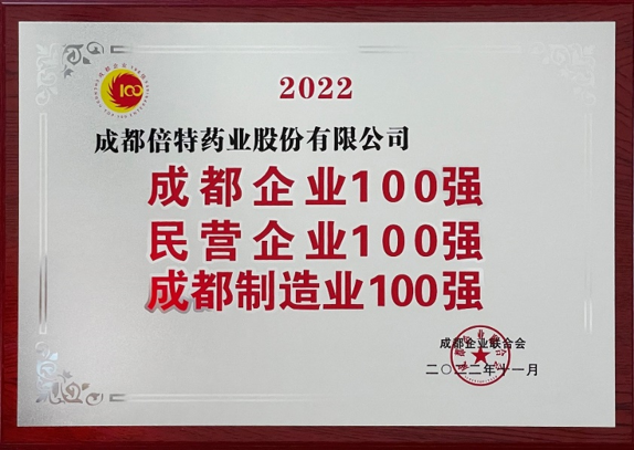 11月25日,在成都市经信局等相关部门指导下,成都企业联合会正式发布“2022成都企业100强”系列榜单。成都倍特药业股份有限公司继续名列“成都企业100强”“成都民营企业100强”和“成都制造业企业100强”,排名较上年度分别提升18位、12位、8位。此外,倍特药业以有力的研发投入,名列“2022成都制造业企业100强”研发投入强度前三位。